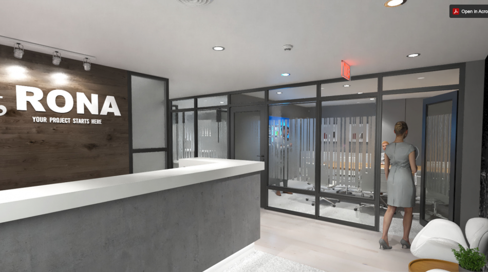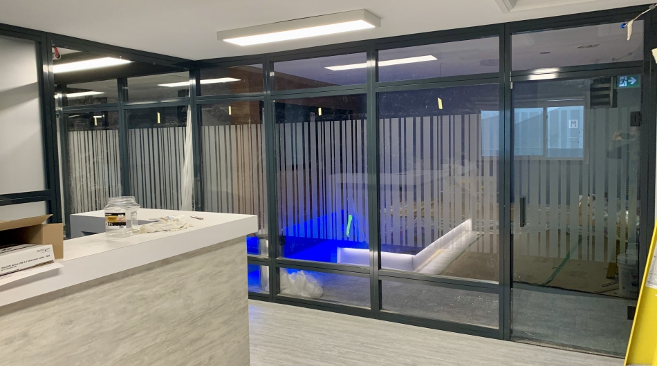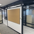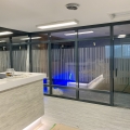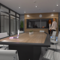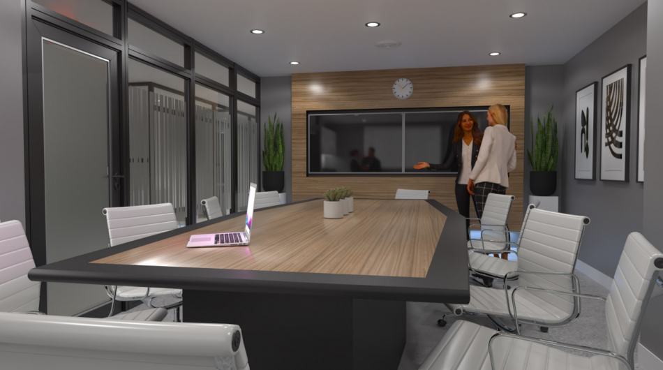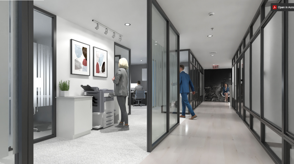 stevensE3 designed a modular space created from clear panels, powdercoated aluminum profiles, custom wall panels and various custom fabricated elements to generate a completely custom finish created to the exact specifications of the client including the fabrication of filing cabinets, counters, a boardroom table, all walls and clear glass panels. The use of clear glass allowing natural light to not only brighten the offices with windows, but to extend that light to those without windows. A custom ceiling with fabric ceiling and integrated lighting helped hide electrical conduit while creating an interesting feature to the central corridor of this office environment. Shown in the above photos are some of the concept renderings along with some completed images of the areas.