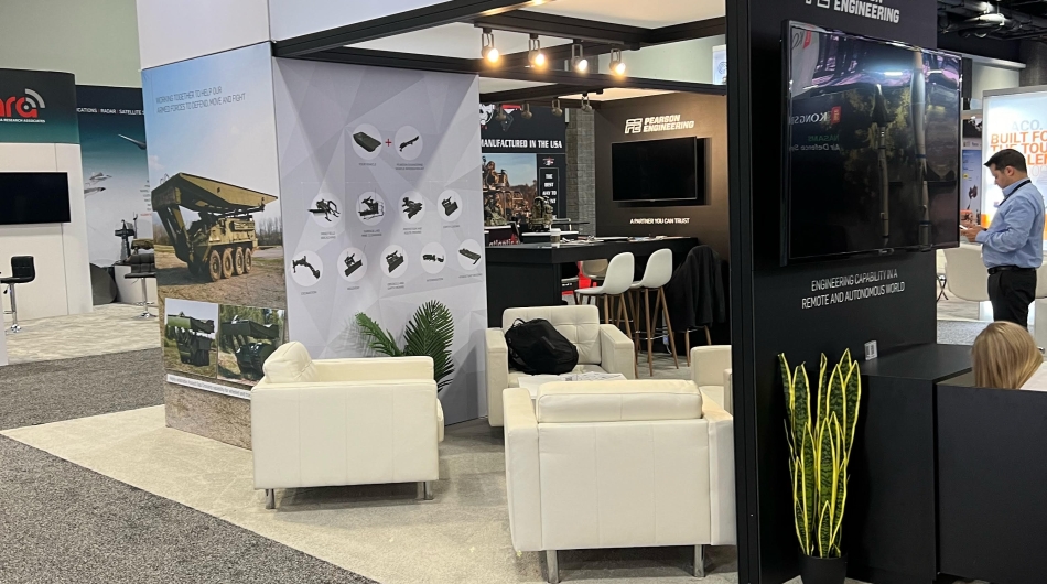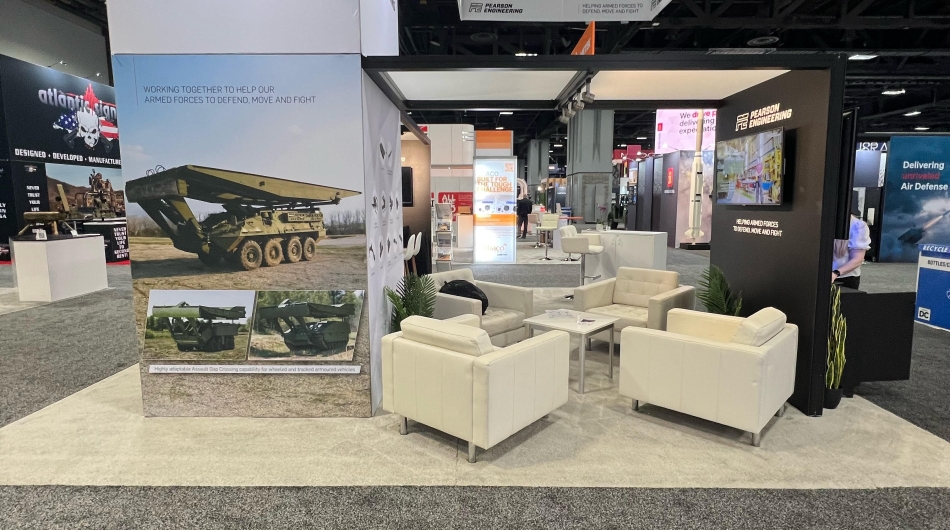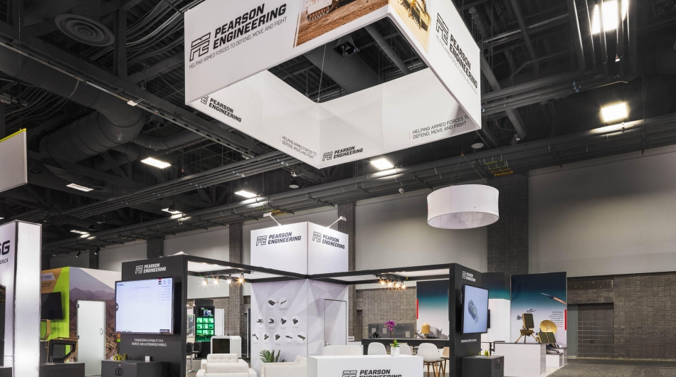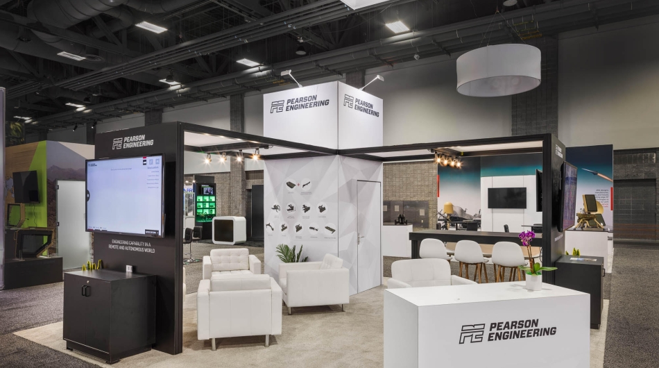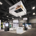 The exhibit designed by stevensE3 created an open, welcoming space that effectively conveyed the client's brand message. The layout featured a prominent reception area at the front, with a modern desk that included hidden storage for functionality. Two lounge areas on either side of the booth provided comfortable seating and charging stations to enhance visitor engagement. High-visibility wayfinding was achieved through a large 10ft x 10ft hanging sign, ensuring the exhibit could be easily located from a distance and reinforcing the client’s branding.
